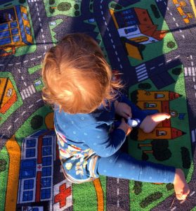 An diesem wunderschönen Spätsommer-Nachmittag im Oktober hat die Maus mit Begeisterung mit dem Traktor, der Eisenbahn und der Sprühflasche auf dem Spielteppich gespielt.