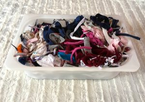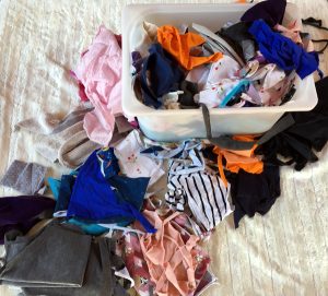 Die Reste, die auch in meinen Augen Fitzelchen sind, werden nun in einer weiteren Kiste gesammelt. Sie sollen irgenwann mal eine Füllung für ein Kissen/Kuscheltier/Sitzsack/… abgeben.