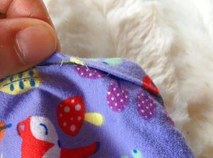 Dazu stichst du beim Nähen nicht durch alle Stoffschichten durch, sondern nur durch die unteren drei Lagen. So ist der Stich später von außen nicht zu sehen. Damit die Naht nicht sofort beim Anziehen reißt, nähst du nur ganz locker, so dass sich der Stoff noch etwas dehnen kann.