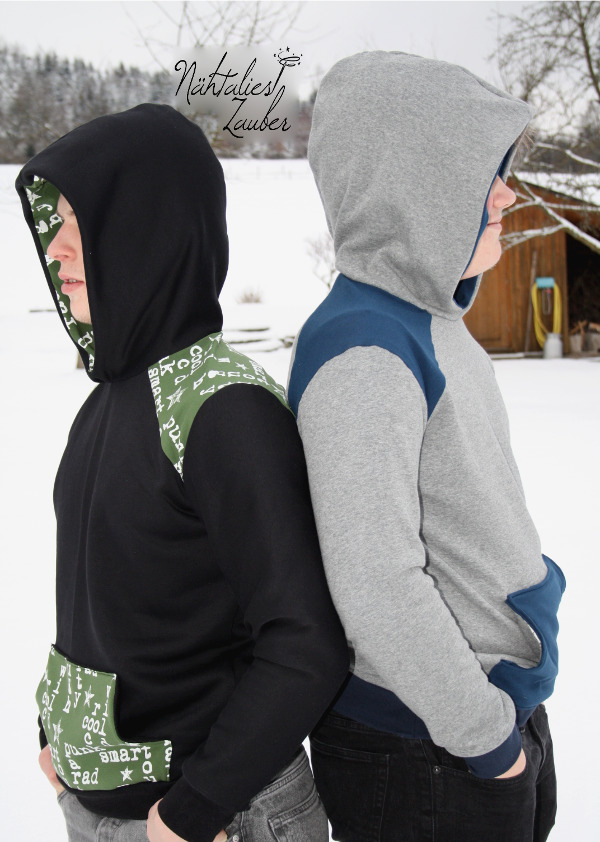 Natalie ist mit ihrem Label „Nähtalies Zauber“ auf facebook und Instagram vertreten. Sie hat für ihren Mann gleich zwei Pullover genäht. Damit beide Hoodies gleichzeitig auf den Bildern zu sehen sind, hat sie ihre Brüder zum Fotografieren gewinnen können. Und was hat sie davon? Die beiden wollen nun auch jeweils einen eigenen Pullover 🙂