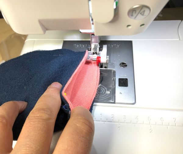 Nun nähst du das Bündchen wie oben beschrieben an. Achte dabei darauf, beim Nähen alle vier Stofflagen zu erwischen.